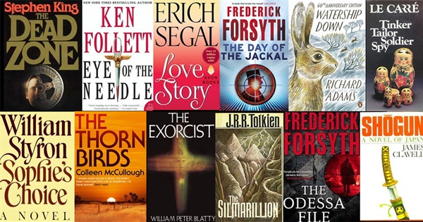 Bestsellers by Tolkien, Stephen King, Ken Follett, Frederick Forsyth, Agatha Christie, John le Carré. Adventure, romance, espionage drama, horror & fantasy. This list uses a bestseller table in "The Chronology of American Literature: America's Literary Achievements from the Colonial Era to Modern Times" by Daniel S. Burt (2004). If a book appeared twice on the bestseller table, I substituted a film version or a book sequel (though obviously the rank refers to the original book).