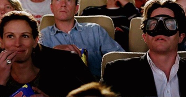 List image: Notting Hill, just because I love this shot of Hugh Grant's character watching a movie while wearing his prescription scuba mask, because he's misplaced his glasses. Unfortunately, *very* few of the movies I've seen have been in the company of Julia Roberts.... none, actually