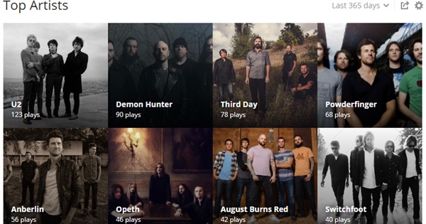 They're sorted in descending order, from most listened to (U2 with 123 listens) to least (Arctic Monkeys / Biffy Clyro / Creed / Fair to Midland with 8).