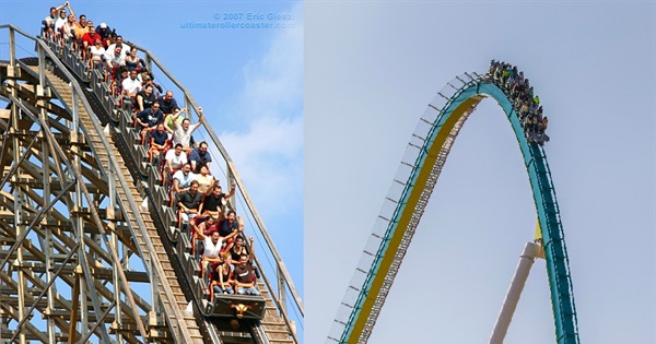 Amusement Today's "Top 50 Steel Coasters" and "Top 50 Wooden Coasters" compiled into a list of 100 roller coasters.