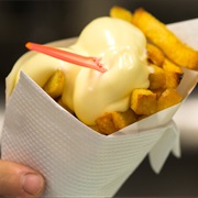 French fries are served hot, either soft or crispy, and are generally eaten as part of lunch or dinner or by themselves as a snack, and they commonly appear on the menus of diners, fast food restaurants, pubs, and bars. They are usually salted and, depending on the country, may be served with ketchup, vinegar, mayonnaise, tomato sauce, or other local specialties.