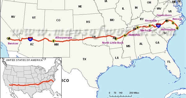 Interstate 40 is a major east-west highway in the south-central United States, stretching for 2,555.10 miles through 8 states, from Barstow, California to Wilmington, North Carolina. This is a list of cities and attractions along or near the Interstate, from west to east.