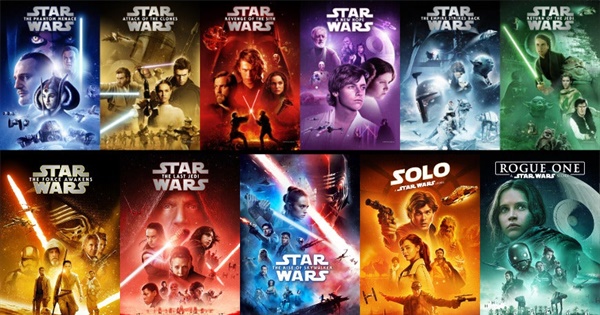 The complete list of Star Wars movies, including The Skywalker Saga, A Star Wars Story duology, The Clone Wars, and the two Ewok films.