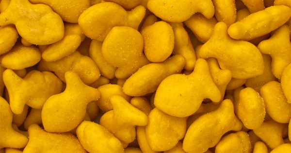 Goldfish are fish-shaped crackers manufactured by Pepperidge Farm, which is a division of the Campbell Soup Company. The crackers have been available in several varieties and, since 1962, 40% of the crackers contain a small imprint of an eye and a smile.